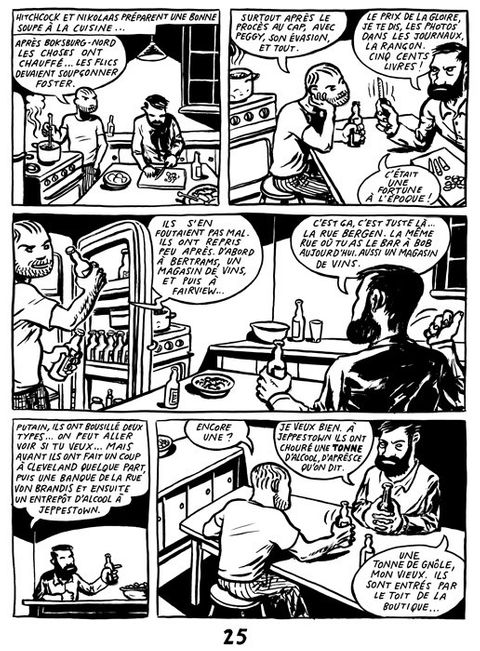 En 1914, en Afrique du Sud, “die Foster Bende” (la Bande à Foster, sorte de Bande à Bonnot sud-Africaine) défraie la presse locale : composée de Foster, Maxim et Mezar, le gang, traqué par la police après de nombreux vols et meurtres, se suicide dans une grotte, ainsi que Peggy, la femme de Foster. Cette histoire vraie, patrimoine de l’histoire obscure de l’Afrique du Sud, est la base de ce livre, scénarisé par Ryk Hattingh et dessiné par Conrad Botes, l’un des deux principaux artistes du groupe Bitterkomix (avec Joe Dog alias Anton Kannemeyer : voir l’anthologie de ce groupe publiée par L’Association en 2009). Ce récit (publié en 2000 par Bitterkomix) est construit sur deux niveaux : à notre époque, au Cap, les deux protagonistes, Hitchcock et Nikolaas, décident d’enquêter et de retourner sur les traces de la Bande à Foster. Eux-mêmes quelque peu borderline, entre bouteilles et bagarres, fascinés par cette histoire, retracent l’itinéraire sanglant des meurtriers de 1914, jusqu’à la grotte de leur suicide collectif ; et parallèlement, s’appuyant sur d’authentiques coupures de presse d’époque, Botes redessine les événements. Le pinceau vigoureux et expressionniste de Conrad Botes sert à merveille cette mise en abyme, mélange d’un haletant thriller de l’époque des premiers “bandits en voiture” et d’une peinture déglinguée de l’Afrique du Sud contemporaine.