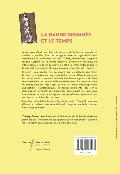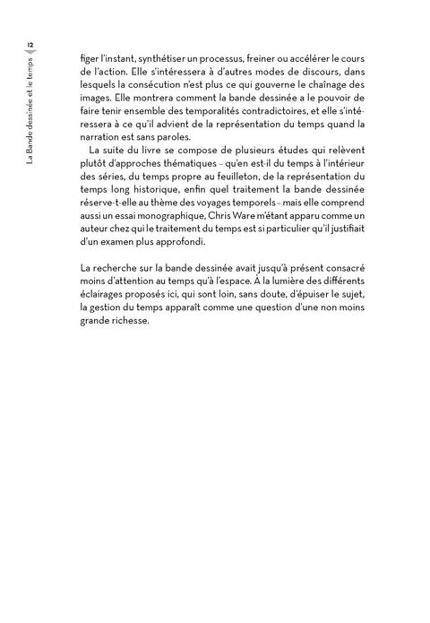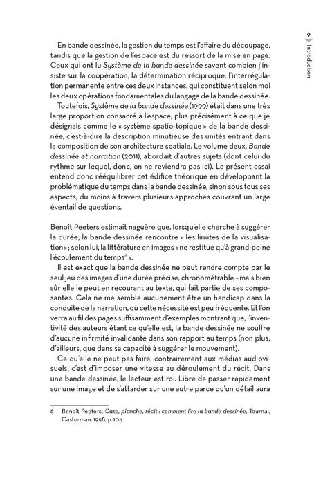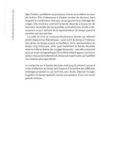 Le spécialiste incontournable de la théorie de la BD, Thierry Groensteen, publie le 3e tome de sa série Système de la bande dessinée. Analysant les phénomènes rythmiques et la temporalité dans la bande dessinée, il montre de quelles manières la bande dessinée affronte le problème du passage du temps et comment elle parvient à le rendre sensible, du découpage de l'action séquentielle jusqu'au temps long de l'histoire. Quels sont les procédés mis en oeuvre par les artistes pour figer l'instant, synthétiser un processus, freiner ou accélérer le cours de l'action ? Comment la bande dessinée a le pouvoir de faire tenir ensemble des temporalités contradictoires ? Comment représenter le temps quand la narration est sans paroles ? Thierry Groensteen décrit chaque propriété de la bande dessinée, chaque instrument graphique ou narratif lié à la représentation du temps, démontrant ainsi la richesse de cette question en bande dessinée.