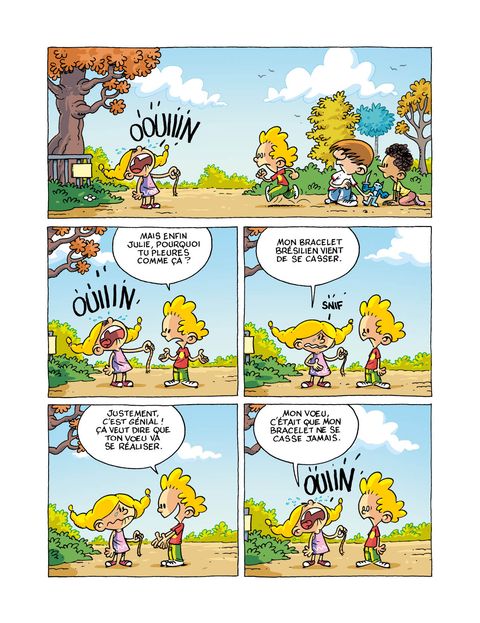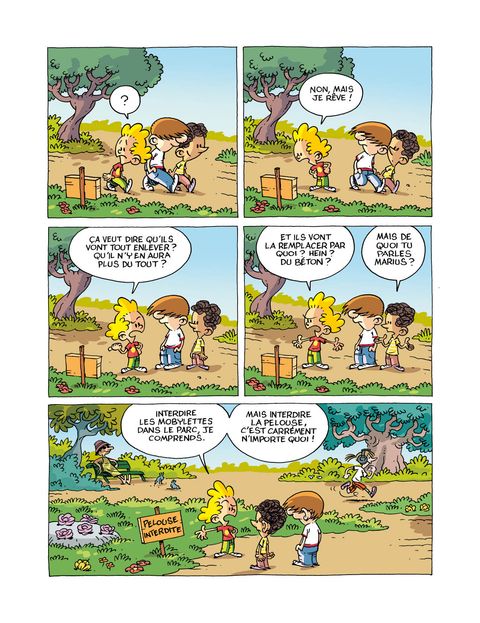 <div>Jouer au parc avec ses potes, c'est toute une aventure !</div><div>Marius, Medhi, Rodrigue et Julie passent leur temps au parc municipal. Ils ne s'ennuient jamais. Ou alors pas longtemps, car le parc leur offre tout ce qu'un enfant peut espérer : de l'action, du mystère, de l'aventure et des possibilités de jeux infinies. Cela ne les empêche pas d'avoir un oeil sur ce qui les entoure et, une chose est sûre, s'ils voient le monde avec leurs yeux d'enfants, leur analyse est bien plus pertinente que celles de beaucoup d'adultes.</div>