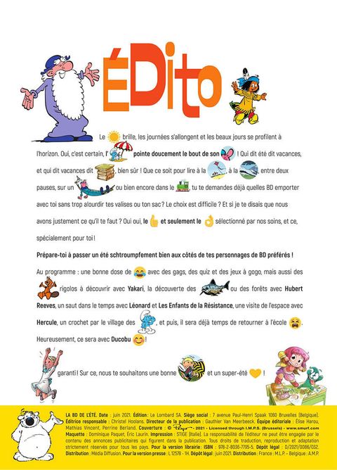 Le meilleur de la BD jeunesse du Lombard enfin réuni dans un seul album. Retrouvez Les Schtroumpfs, Ducobu, Léonard, Yakari ou encore Ernest et Rebecca dans une super compil qui amusera les enfants pendant tout l'été ! Dans ce recueil, on trouvera deux albums complets (Les Enfants de la Résistance tome 1 et Hercule tome 1) mais aussi une sélection de jeux et des meilleurs gags de tous les héros préférés des enfants.