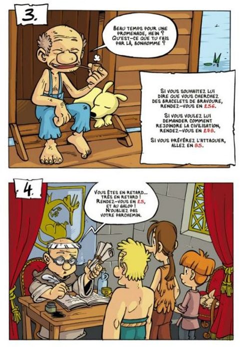 An de Grâce 1012, terres du bon roi Louileupou. Trois frères rêvent secrètement d’appartenir à l’ordre des chevaliers de la royauté... Des chevaliers sans peur et sans reproche, capables de parcourir de folles distances, d’occire le plus dangereux des voleurs et de défendre les champs du valeureux paysan. L’un de ces trois frères, c’est vous ! Pour atteindre votre but, vous devrez parcourir l’immense étendue du royaume à la recherche des bracelets de bravoure. Mais saurez-vous gravir des montagnes enneigées , traverser un lac hanté ou une sombre forêt ? Et si vous tombiez nez à nez avec un troll ou un vieux sorcier ?! Avant tout, choisir son personnage et ses compétences spécifiques. Ensuite, évoluer librement dans l’album et construire sa propre aventure au gré des devinettes, des énigmes, des quêtes. Le lecteur, devenu héros de la BD, apprendra des techniques de combat, ramassera des objets magiques, achètera des armes, débusquera des cases cachées qui le mèneront à faire des choix et à trouver le maximum de bracelets de bravoure.