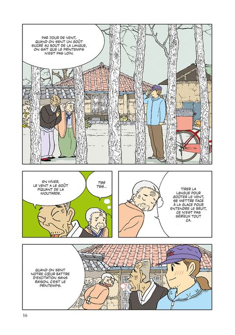 «Une succession d'histoires courtes, d'anecdotes où il nous livre poésie et pensées philosophiques entre deux coups de pédale. En filigrane, Kim Dong Hwa aborde des thèmes d'actualité qu'il rend universels comme l'exode rural, la cassure entre la campagne et la ville, l'isolement des personnes âgées. Sans tomber dans le "c'était mieux avant", La Bicyclette rouge rend hommage à un certain art de vivre. Cette oeuvre reposante tout en simplicité est atypique des parutions manga/manwha actuelles, une pause salutaire et enrichissante.» Sabine Soma, Orient-Extrême.net