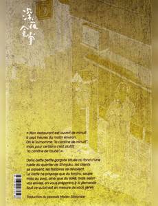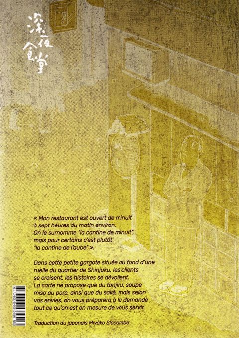 « Mon restaurant est ouvert de minuit à sept heures du matin environ. On le surnomme "la cantine de minuit", mais pour certains c'est plutôt "la cantine de l'aube" ».Dans cette petite gargote situé au fond d'une ruelle du quartier de Shinjuku, les clients se croisent, les histoires se dévoilent. La carte ne propose que du tonjiru, soupe de miso au porc, ainsi que du saké, mais selon vos envies, on vous préparera à la demande tout ce qu'on est en mesure de vous servir.