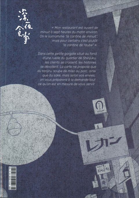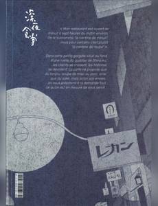 Dans ce petit restaurant situé au fond d'une ruelle du quartier de Shinjuku, le patron vous accueille de minuit à sept heures du matin pour servir des petits plats typiques du Japon qui réveilleront les papilles et les souvenirs du temps passé. Car ici, chaque plat est lié aux souvenirs d'un personnage : yakuza, stripteaseuse, boxer... Avec son trait fin et épuré, son style très personnel, Yarô Abe, qui cite parmi ses références Yoshiharu Tsuge, brosse des portraits drôles et émouvants de personnages touchants, chacun à leur manière, dans un manga qui a quelque chose d'apaisant et de réconfortant. La Cantine de minuit, c'est un petit restaurant qui vous remplit le coeur et l'estomac, et une agréable manière de découvrir que la cuisine japonaise est très loin de se limiter aux sushis.