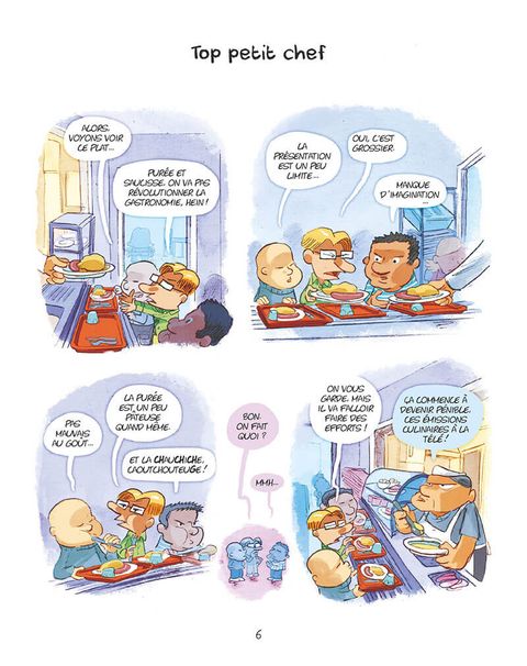 Les souvenirs de Nob y suffisent-ils ? Ce qui frappe dans « La cantoche », c'est l'extraordinaire diversité des histoires. Toujours drôles et percutantes, elles vous rappelleront immanquablement des souvenirs (heureux, parfois cuisants...) de situations que vivent la plupart des enfants scolarisés. Dans cette série, pas de héros récurrent. Mais des garçons et des filles, des petits gros, des grandes minces ou des costauds du cerveau, rassemblés par la cloche en ce lieu étrange. Au programme : bataille de nourriture, coups bas, glissade et rigolade. Mais aussi pique-nique et barbecue, car l'ambiance cantine ne s'arrête pas au simple réfectoire de l'école. À la récré ou en classe verte, on passe son temps à manger et les blagues ne s'arrêtent jamais. Si « La Cantoche » n'est pas une série qui vous cherchera à vous mettre l'eau à la bouche, en revanche elle vous mettra assurément le sourire aux lèvres... Promis !