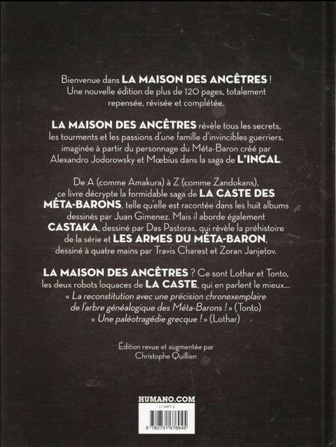Édition revue et augmentée du making-of de La Caste des Méta-barons. Ouvrage de référence sur l'univers de La Caste des Méta-Barons, La Maison des ancêtres rassemble interviews des auteurs, dessins et crayonnés, ainsi que des planches inédites. Cette édition a été revue et augmentée en 2016 par Christophe Quillien, avec notamment des informations sur la série Castaka.