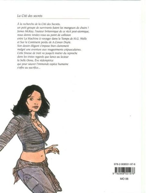 A la recherche de la Cité des Secrets, un petit groupe de survivants fuient les mangeurs de chairs ! James McKay, l'auteur britannique de ce récit post-atomique, nous donne rendez-vous au point de collision entre La Machine à voyager dans le Temps de H.G. Wells et Sur le Continent perdu de A. Conan Doyle. Son dessin élégant s'impose bien clairement malgré une aventure aux rougeoiements crépusculaires. Cette finesse de trait va jusqu'à insérer du reproche dans les tristes regards que lance au lecteur la belle Oona, Eve rédemptrice qui pour sauver l'immonde espèce humaine s'offre en sacrifice...