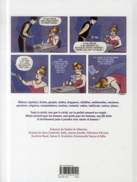 « Je t'adore mais tout compte fait, je préfère coucher avec ta soeur », ou encore « Je te quitte. mais si on pouvait continuer à avoir des rapports sexuels, ça m'arrangerait bien ». Ils l'ont dit, elles en rient. Sophie de Villenoisy et son collectif de dessinatrices s'amusent à révéler les pires bassesses de ces connards qui enchaînent pas de « bourrés », grands écarts et échappés. 100 % véridique.