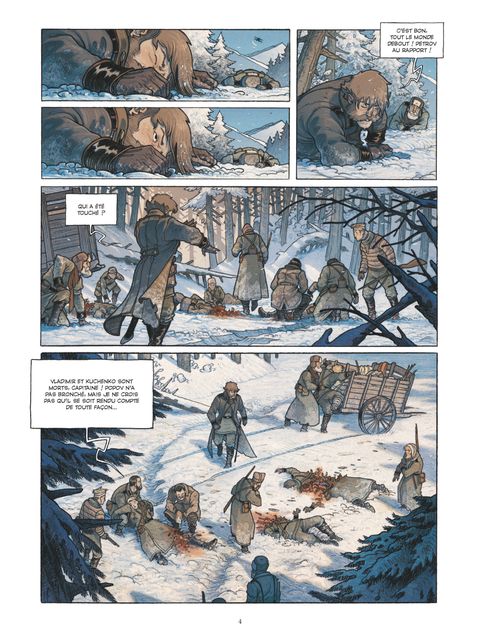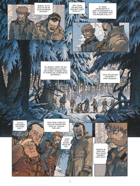 L'imaginaire pour transcender la guerre. A bout de forces, un groupe composé de soldats et de civils russes s'éloigne péniblement du front. La première guerre mondiale s'étire et si cet ignoble conflit meurtrit les corps, il épuise aussi les esprits les plus sains. Pour soulager le moral des troupes, le soldat Zvoga, ancien capitaine de son état, préconise une halte dans un manoir isolé près duquel ils passent. Ce n'est pas du goût de son lieutenant, mais ce sera l'occasion pour le " Doc. " de soigner les blessés et d'offrir à ses filles qui l'accompagnent, Natalia et Irina, un peu de repos. La Baronne qui vit dans ses lieux avec les siens les accueille malgré elle, mais leur dissimule un secret. En effet, vit caché dans les murs de sa propriété un groupe d'enfants qu'elle tente de préserver de la guerre et de ses ravages. Une nuit, Natalia les découvre mais ces derniers la prennent tout de suite en amitié grâce aux histoires merveilleuses qu'elle leur conte et qui allègent leur souffrance et les tourments de la guerre. Mais la barbarie n'est jamais loin ; une mutinerie se prépare au sein du groupe de soldats et des rumeurs inquiétantes circulent... On aurait vu la dernière ombre roder en ces lieux... Premier tome d'un diptyque inspiré dans ses ambiances par le Labyrinthe de Pan, La Dernière Ombre met en scène les tourments de la guerre et comment la puissance de l'imaginaire peut permettre d'oublier la violence humaine.