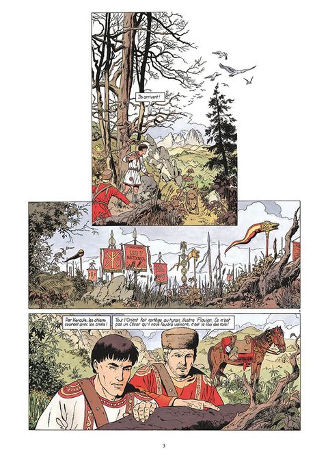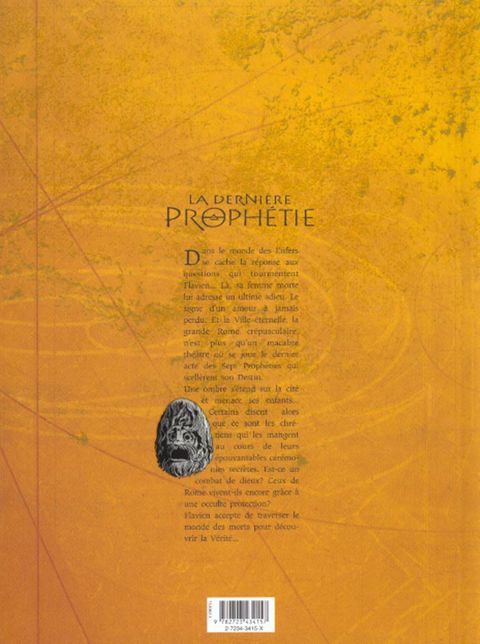 « Septembre 394. L'Antiquité touche à son crépuscule. Menacé sur toutes ses frontières, le vieil empire romain semble plus absorbé par ses déchirements internes que par le péril barbare. L'empereur chrétien Théodose et son maître de la cavalerie Stilico pénètrent dans le diocèse d'Italie à la tête d'une armée bien peu romaine... Autour de ses vieilles légions caracolent les bandes de Goths fraîchement baptisées d'Alaric, des Alains, des contingents d'Arméniens, des Mèdes, des Arabes et même des Huns ! »Les chrétiens investissent Rome, annonçant la chute du paganisme. Et c'est alors le début de conflits aussi bien guerriers que religieux, qui plongent Rome dans la tourmente. Au milieu de ces troubles, se débat tant bien que mal Flavien,jusqu'au jour où sa famille est assassinée. Initié presque par hasard au culte sibyllin, Flavien va littéralement descendre aux Enfers pour revoir sa défunte aimée. Mais, derrière la porte des Enfers, il va surtout devenir l'Elu, celui à qui il appartient de découvrir le dessein des dieux, un dessein scellé par sept prophéties, dont six ont déjà été révélées... Et rien ne dit que la dernière prophétie sera le prélude à une ère de bonheur... Superbe nouvelle série de "Gilles Chaillet", dont voici le premier tome.