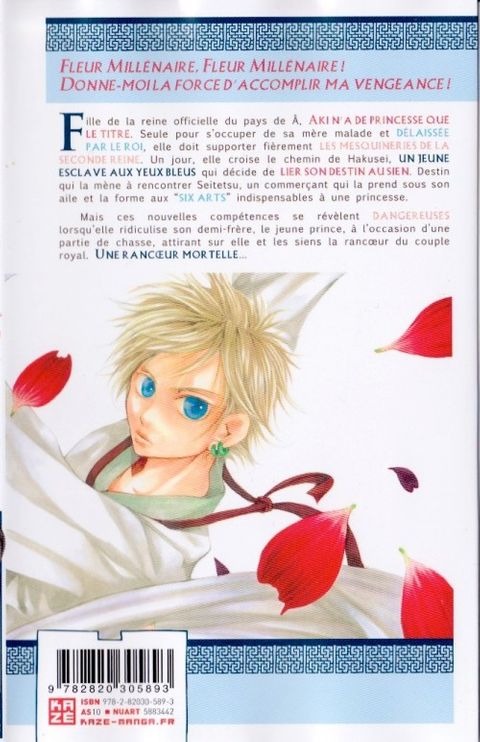 Fille de la reine officielle du pays de Â, Aki n’a de princesse que le titre. Seule pour s’occuper de sa mère malade et délaissée par le roi, elle doit supporter fièrement les mesquineries de la seconde reine. Un jour, elle croise le chemin de Hakusei, un jeune esclave aux yeux bleus qui décide de lier son destin au sien. Destin qui la mène à rencontrer Seitetsu, un commerçant qui la prend sous son aile et la forme aux “six arts” indispensables à une princesse. Mais ces nouvelles compétences se révèlent dangereuses lorsqu’elle ridiculise son demi-frère, le jeune prince, à l’occasion d’une partie de chasse, attirant sur elle et les siens la rancœur du couple royal. Une rancœur mortelle…