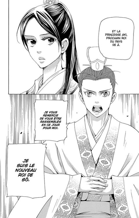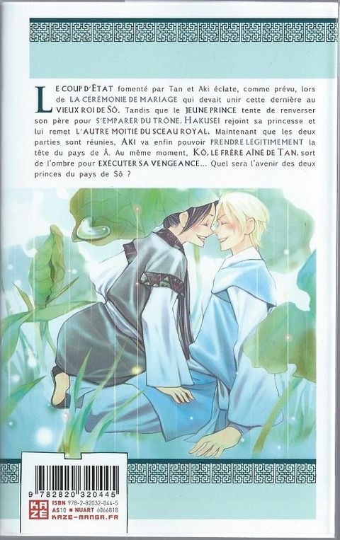 Le coup d’État fomenté par Tan et Aki éclate, comme prévu, lors de la cérémonie de mariage qui devait unir cette dernière au vieux roi de Sô. Tandis que le jeune prince tente de renverser son père pour s’emparer du trône, Hakusei rejoint sa princesse et lui remet l’autre moitié du sceau royal. Maintenant que les deux parties sont réunies, Aki va enfin pouvoir prendre légitimement la tête du pays de Â. Au même moment, Kô, le frère aîné de Tan, sort de l’ombre pour exécuter sa vengeance… Quel sera l’avenir des deux princes du pays de Sô ?