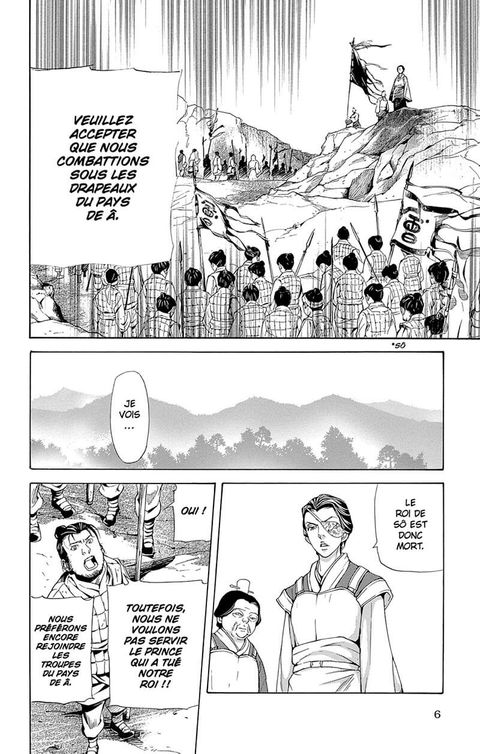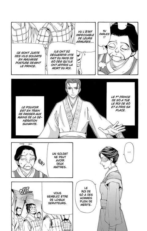 La guerre contre l’infâme reine de Do est imminente. Soutenue par Tan, le nouveau roi de Sô, et plus que jamais proche de Hakusei, Aki se prépare à contre-attaquer. Mais ses retrouvailles avec une servante du pays de  l’amène à comprendre la disparition de celui qui fut son mentor et plus encore, Seitetsu. À la veille de cet affron- tement inévitable, cette révélation incite l’ardente princesse à prendre une décision cruciale dans sa relation avec son fidèle serviteur...