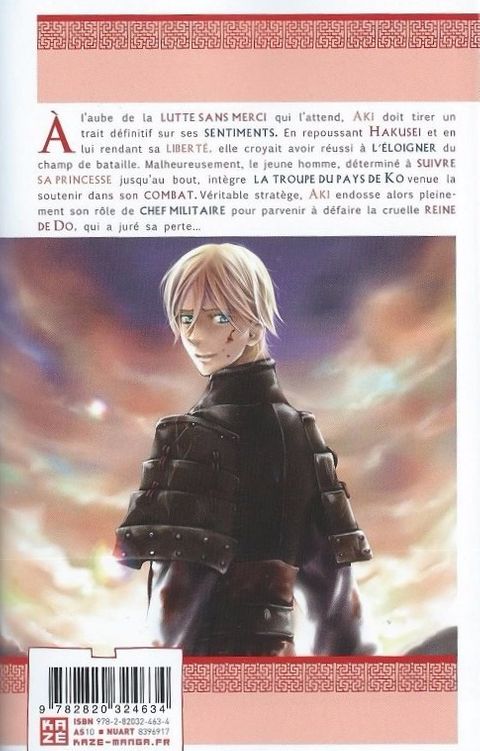 À l’aube de la lutte sans merci qui l'attend, Aki doit tirer un trait définitif sur ses sentiments. En repoussant Hakusei et en lui rendant sa liberté, elle croyait avoir réussi à l’éloigner du champ de bataille. Malheureusement, le jeune homme, déterminé à suivre sa princesse jusqu'au bout, intègre la troupe du pays de Ko venu offrir son soutien aux combats. Véritable stratège, Aki endosse alors pleinement son rôle de chef militaire pour parvenir à défaire la cruelle reine de Do, qui a juré sa perte…