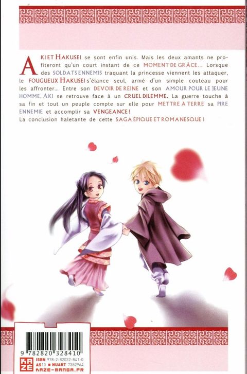 Aki et Hakusei se sont enfin unis. Mais les deux amants ne profiteront qu'un court instant de ce moment de grâce... Lorsque des soldats ennemis traquant la princesse viennent les attaquer, le fougueux Hakusei s'élance seul, armé d'un simple couteau pour les affronter... Entre son devoir de reine et son amour pour le jeune homme, Aki se retrouve face à un cruel dilemme. La guerre touche à sa fin et tout un peuple compte sur elle pour mettre à terre sa pire ennemie et accomplir sa vengeance ! La conclusion haletante de cette saga épique et romanesque !