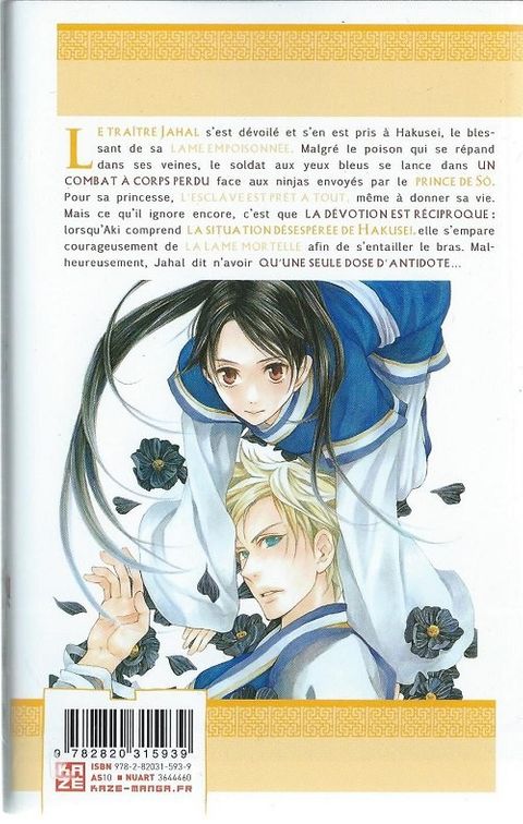 Le traître Jahal s'est dévoilé et s'en est pris à Hakusei, le blessant de sa lame empoisonnée. Malgré le poison qui se répand dans ses veines, le soldat aux yeux bleus se lance dans un combat à corps perdu face aux ninjas envoyés par le prince de Sô. Pour sa princesse, l'esclave est prêt à tout, même à donner sa vie, mais ce qu'il ignore encore, c'est que la dévotion est réciproque : lorsque Aki comprend la situation désespérée d'Hakusei, elle s'empare courageusement de la lame mortelle afin de s'entailler le bras. Malheureusement Jahal dit n'avoir qu'une seule dose d'antidote…