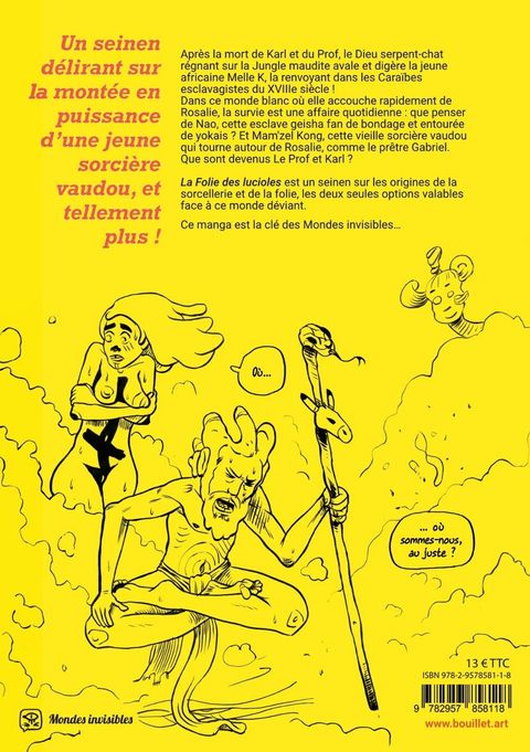 Un seinen délirant sur la montée en puissance d’une jeune sorcière vaudou, et tellement plus !Après la mort de Karl et du Prof, le Dieu serpent-chat régnant sur la Jungle maudite avale et digère la jeune africaine Melle K, la renvoyant dans les Caraïbes esclavagistes du XVIIIe siècle !Dans ce monde blanc où elle accouche rapidement de Rosalie, la survie est une affaire quotidienne : que penser de Nao, cette esclave geisha fan de bondage et entourée de yokais ? Et Mam'zel Kong, cette vieille sorcière vaudou qui tourne autour de Rosalie, comme le prêtre Gabriel. Que sont devenus Le Prof et Karl ?La Folie des lucioles est un seinen sur les origines de la sorcellerie et de la folie, les deux seules options valables face à ce monde déviant.Ce manga est la clé des Mondes invisibles...