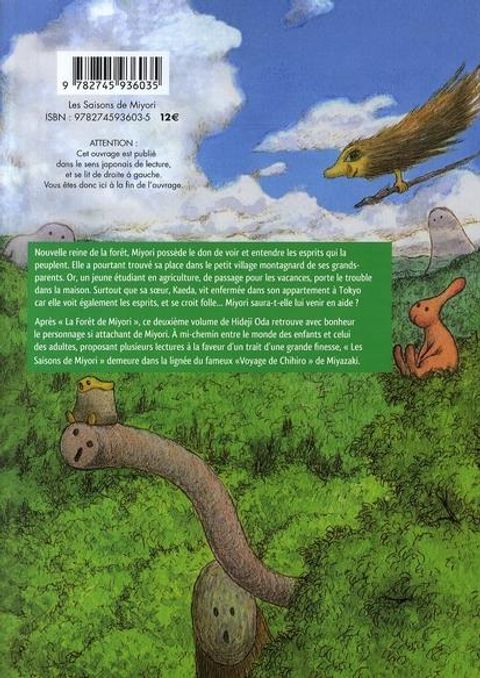 Nouvelle reine de la forêt, miyori possède le don de voir et entendre les esprits qui la peuplent elle a pourtant trouvé sa place dans le petit village montagnard de ses grands-parents. Or, un jeune étudiant en agriculture, de passage pour les vacances, porte le trouble dans la maison. surtout que sa soeur, kaeda, vit enfermée dans son appartement à tokyo car elle voit également les esprits, et se croit folle. miyori saura-t-elle lui venir en aide ? après "" la forêt de miyori "", ce deuxième volume de hideji oda retrouve avec bonheur le personnage si attachant de miyori. a mi-chemin entre le monde des enfants et celui des adultes, proposant plusieurs lectures à la faveur d'un trait d'une grande finesse, "" les saisons de miyori "" demeure dans la lignée du fameux "" voyage de chihiro "" de miyazaki.