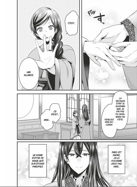 Plongez dans un fascinant voyage au cœur de la Chine médiévale, où chaque geste peut faire basculer le destin d'un empire. Yuran, la plus talentueuse marchande de son époque, mène une vie paisible rythmée par ses affaires prospères. Jusqu'au jour où elle réalise qu'elle a déjà vingt-huit ans... et reçoit une missive qui bouleverse son destin. L'empereur en personne la somme d'épouser Kogetsu Haku, un jeune et brillant vassal, tout en prenant soin des concubines du palais. Yuran se retrouve alors propulsée dans un univers de pouvoir et de complots. D'autant plus que son nouvel époux semble cacher bien des secrets... Au cœur des intrigues de la cour impériale, entre alliances, rivalités et sombres complots, Yuran devra naviguer avec finesse pour découvrir la vérité qui se cache derrière cette union... Plongez dans un fascinant voyage au cœur de la Chine médiévale, où chaque geste peut faire basculer le destin d'un empire.