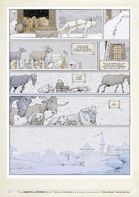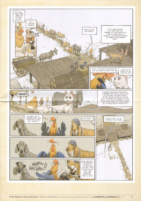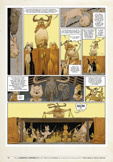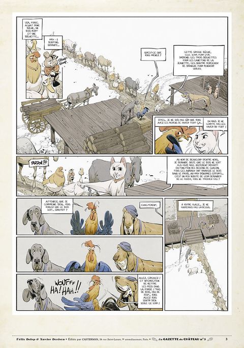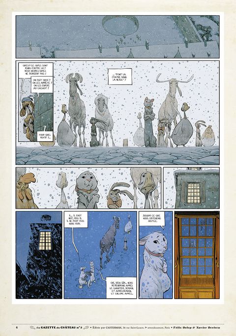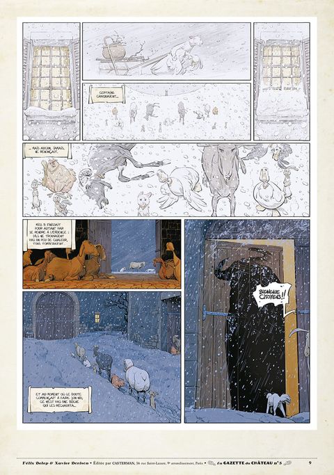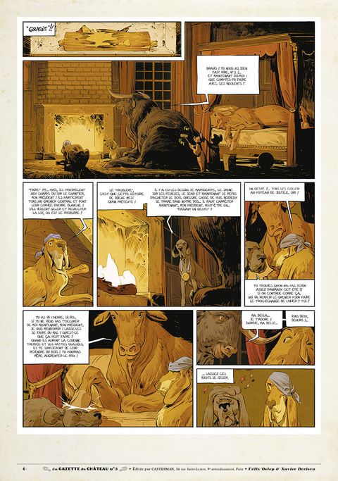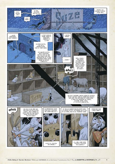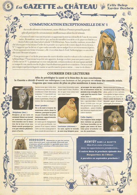Fermement opposés à la dictature du taureau Silvio, Miss B et ses amis vont passer un rude hiver... Toujours aidés en secret par le rat Azélar, Miss B et le lapin César ont réussi à convaincre certains animaux de ne plus se cacher pour faire dissidence, tout en restant du côté de la non-violence. Ce dernier point est capital, car si les animaux ne parviennent pas à résister à leur désir de se faire justice eux-mêmes, alors ils feront le jeu de leurs ennemis. Pour exposer à Silvio leur désobéissance pacifique, Miss B et ses compagnons organisent un sit-in sous les fenêtres du despote, bravant la nuit et le froid glacial. Bientôt, c'est une fête pour soutenir le moral des valeureux résistants qui est organisée, mais Silvio ne l'entend pas de cette oreille. Et une fois encore, c'est à la tentation de la violence que les animaux devront résister... Cette cinquième Gazette du Château présente la deuxième partie du tome 2 de la série, Les Marguerites de l'hiver (à paraître en septembre 2020).