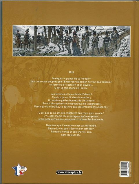 Pendant la campagne de Russie, en pleine retraite sous la neige, un jeune tambour de la Grande Armée, nommé "Sauve-la-vie" est poursuivi dans les bois par deux soldats. Ils sont violents puisqu'ils finissent par lui tirer dessus. Ils semblent en vouloir à un sac que l'enfant emporte avec lui. Ce que l'enfant transporte est à l'évidence précieux, et ce dernier n'est pas prêt à s'en défaire. Ce gamin, c'est le fils de Barthélémy et le protégé de Fanfan la Griotte une lavandière qui suit les armées napoléoniennes. Résumé t3 : Pour la première fois, la Grande Armée doit se battre sur le sol de France. Marches forcées Batailles contre-marche Mais les hommes, les femmes et les enfants qui la composent restent les héritiers de la Révolution.