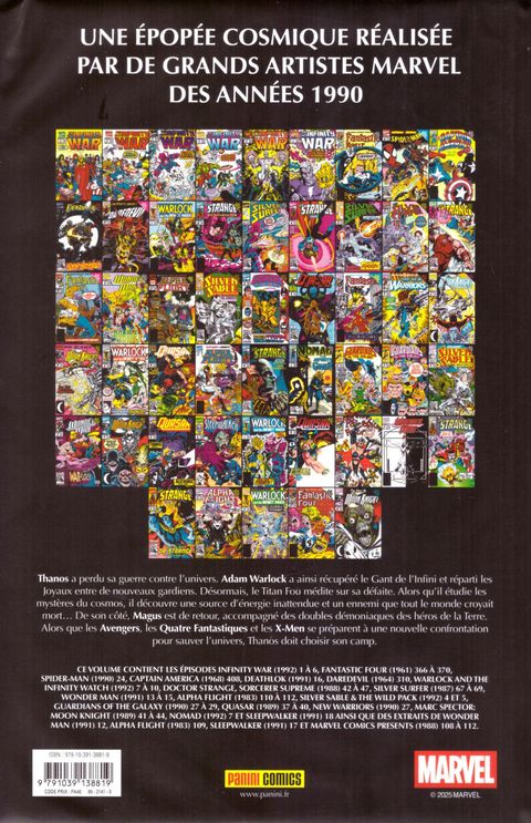Le Magus, incarnation maléfique d'Adam Warlock, est de retour... et il veut s'emparer du pouvoir suprême. Réussira-t-il là où Thanos a échoué ? Tandis que le Docteur Strange et Galactus cherchent des réponses, Thanos rejoint les Gardiens de l'Infini. Les Avengers et les X-Men viennent aussi prêter main forte, et c'est bientôt tout l'univers Marvel qui se mobilise pour contrer cette menace qui pourrait bien l'anéantir ! Un recueil titanesque : plus de 1300 pages pour tout savoir sur La Guerre de l'Infini, suite du mythique Gant de l'Infini ! Contrairement à la première saga qui y était allée doucement sur les épisodes tie-ins, celle-ci implique une multitude de séries : près d'une vingtaine, des plus connues (Spider-Man, Fantastic Four...) aux plus inattendues (Sleepwalker, Deathlok, Silver Sable...). Et plusieurs épisodes sont inédits en France !