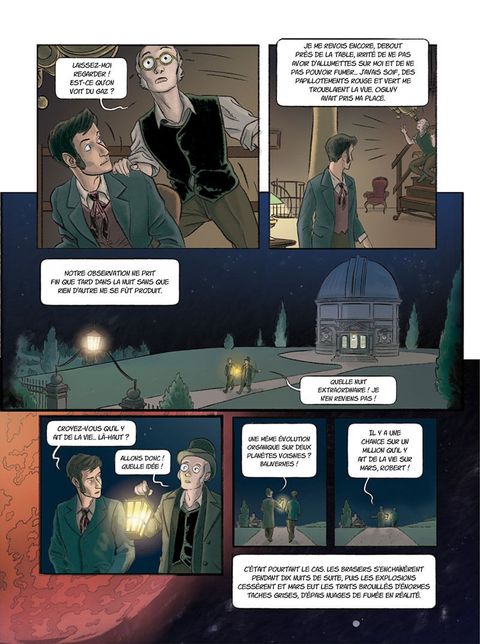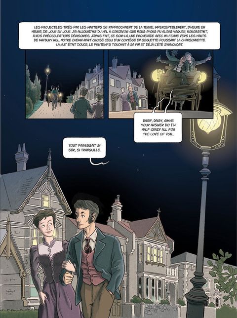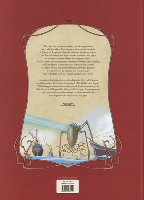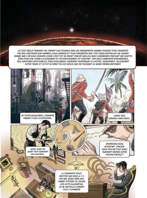L'adaptation en bande dessinée du classique de H. G. Wells ! 1894. Des astronomes sont témoins d'étranges activités à la surface de Mars, comme des éclairs ou des explosions de gaz incandescent. Des météores venant de la planète rouge se dirigent bientôt vers la Terre. Des cylindres s'écrasent et libèrent des engins mécaniques contrôlés par des créatures tentaculaires installées à l'intérieur. Ces tripodes, armés de leur rayon ardent et d'un gaz toxique appelé " fumée noire ", se dirigent vers Londres en désintégrant tout sur leur passage. L'armée britannique réplique. Mais rapidement, la lutte tourne à l'avantage des envahisseurs. Commence alors une fuite dans un monde ravagé...