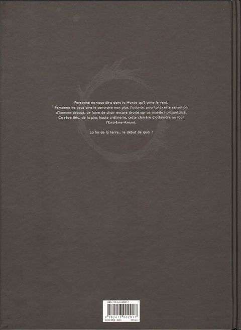 Après une formation impitoyable, et alors qu'ils étaient encore enfants, ils ont quitté Aberlaas, la cité des confins. Leur mission : marcher d'ouest en est jusqu'à atteindre l'Extrême-Amont, source mythique du vent qui balaye leur monde jour et nuit, sans trêve ni répit. Ils sont la 34e Horde du Contrevent. Golgoth ouvre la marche ; derrière lui, Sov, le scribe, sur les épaules duquel l'avenir de la Horde tout entière va bientôt reposer...
