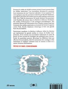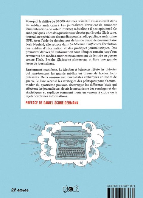 La Machine à influencer est le premier livre de la journaliste Brooke Gladstone, vedette de la radio publique NPR, avec son émission On the Media où elle décortique depuis 14 ans le traitement de l'information par les médias. Avec l'aide du dessinateur de bande dessinée documentaire Josh Neufeld, elle raconte l'histoire des médias d'information et des pratiques journalistiques, en commençant par les Incas, Hérodote, et l'Acta Diurna du Sénat romain, puis conduit le lecteur à travers deux millénaires, des journaux de la Rome de César jusqu'aux errements de la presse américaine au moment de la guerre d'Irak. Elle livre ses réflexions sur la création, le traitement et la circulation de l'information, mais aussi les manipulations, l'analyse des sondages, des rumeurs, l'utilisation des statistiques... Véritable manifeste, La Machine à influencer réfute la notion que les médias sont une force extérieure, hors de notre contrôle. Grâce une multitude d'anecdotes, et une construction analytique sans faille, Brooke Gladstone et Josh Neufeld fournissent au lecteur des outils pour lui permettre de décrypter les médias d'information.