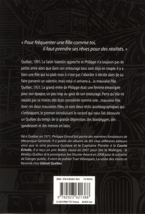 Québec, 1991. La Saint-Valentin approche et Philippe n'a toujours pas de petite amie alors que dans son entourage tous sont déjà en couple. Il y a bien une fille qui lui plaît mais il n'ose pas l'aborder. Il décide alors de lui faire parvenir un valentin, mais celui-ci arrivera à... la mauvaise fille. Québec, 1931. La grand-mère de Philippe était une femme émancipée pour son époque, un peu trop au goût de son entourage. Parce qu'elle ne voulait pas se marier, elle était considérée comme une... mauvaise fille. Avec ces deux mauvaises filles, ce sont deux récits autobiographiques qui s'imbriquent, le premier introduisant le second qui nous fait découvrir un Québec du temps de la grande dépression, des bootleggers, des speakeasies et des messes en latin.