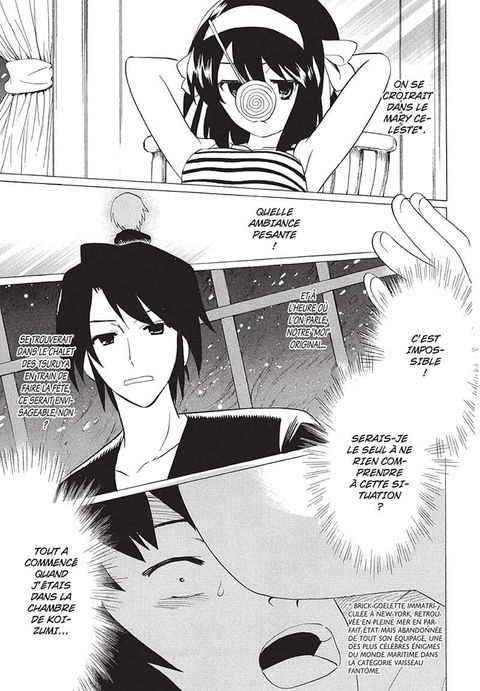 Toujours prisonniers du mystérieux manoir, Kyon et Koizumi vont tenter de résoudre une équation qui se présente à eux. Il existe une chance pour qu'ils puissent quitter le monde alternatif et retrouver leur place dans le monde réel si jamais ils arrivaient à en trouver la réponse. En vacances à la montagne, ils passent les fêtes de fin d'année dans une jolie résidence, prêtée par Tsuruya, où Koizumi a pris soin de leur préparer un petit jeu, comme à son habitude, sans épargner personne avec ses théories hautement scientifiques.