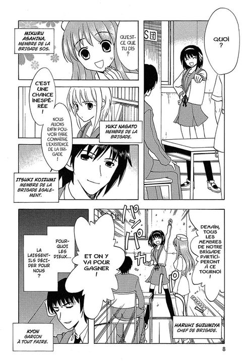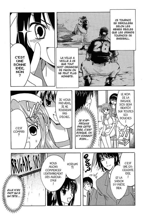 "" La Brigade SOS va participer au tournoi de baseball et je vous préviens qu'on y va pour gagner ! "" Haruhi continue de n'en faire qu'à sa tête et personne n'ose la contredire. Tout ça parce qu'il ne faut pas qu'elle sombre dans la mélancolie car cet état provoque la formation d'un "" espace clos parallèle "" qui pourrait provoquer la fin du monde ! La menace est bien réelle et la catastrophe sans doute imminente. Mais pour le moment, le plus important est de remporter la victoire afin que la brigade se fasse connaître...