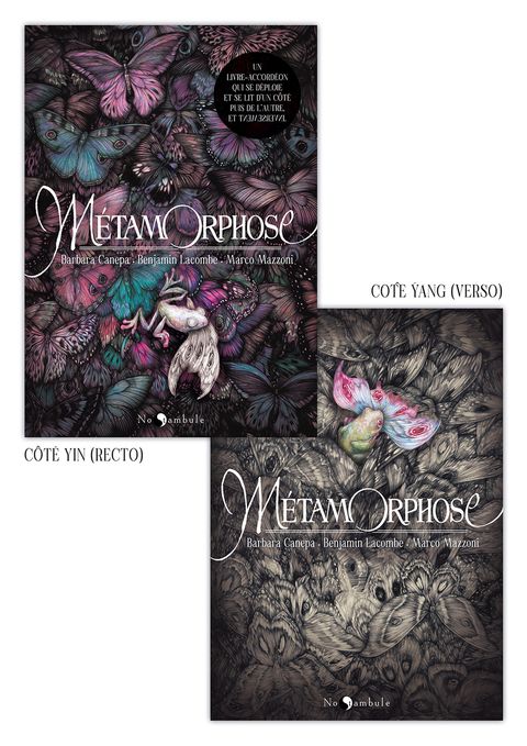 SOUS LA FORME D'UN LEPORELLO, BARBARA CANEPA, BENJAMIN LACOMBE ET MARCO MAZZONI CÉLÈBRENT LE CYCLE DE LA VIE ET DE LA MORT À TRAVERS UNE VISION FANTASMAGORIQUE DE LA NATURE. Véritable célébration de la faune et de la flore, « La Métamorphose » déploie sous la forme d'un leporello qui se lit d'un côté, puis de l'autre, telle une boucle infinie, le cycle fascinant de la vie et de la mort. De petits têtards grouillent sous l'eau, se transforment en grenouilles virevoltant sur fond de nature fantasmagorique, avant de s'éteindre et de donner naissance à une vie nouvelle dont les racines émergent d'une terre nourricière. Porté par les textes de Barbara Canepa (au recto) et Benjamin Lacombe (au verso), le travail de Marco Mazzoni sublime la beauté de la nature en révélant un art du raffinement allégorique.