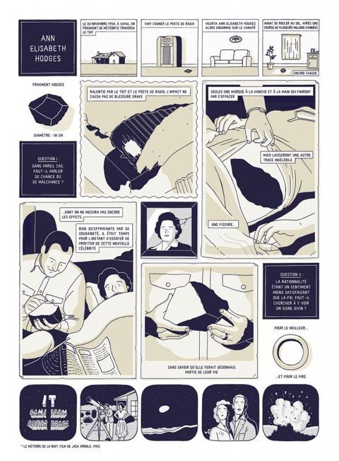 Frappée chez elle par une météorite tombée du ciel, Ann Elisabeth Hodges vit sa vie transformée par la célébrité, elle qui était devenue la première humaine heurtée par un corps céleste. Au travers d'un jeu graphique époustouflant, Fabien Roché vous propose de découvrir cette histoire vraie sous différents angles : personnel, astronomique, historique, judiciaire, poétique et bien sûr... émouvant.