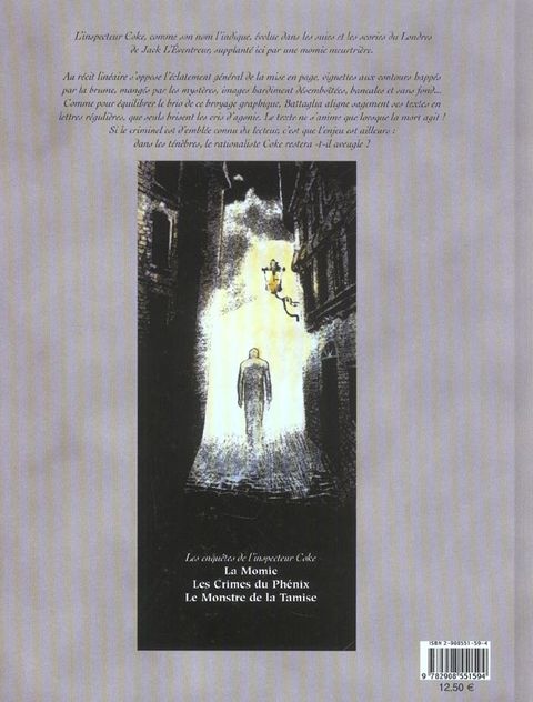 L'inspecteur Coke, comme son nom l'indique, évolue dans les suies et les scories du Londres de Jack L'Eventreur, supplanté ici par une momie meurtrière. Au récit s'oppose l'éclatement général de la mise en page, vignettes aux contours happés par la brume, mangés par les mystères, images hardiment désemboîtées, bancales et sans fond... Comme pour équilibrer le brio de ce broyage graphique, Battaglia aligne sagement ses textes en lettres régulières, que seuls brisent les cris d'agonie. Le texte ne s'anime que lorsque la mort agit ! Si le criminel est d'emblée connu du lecteur, c'est que l'enjeu est d'ailleurs : dans les ténèbres, le rationaliste Coke restera-t-il aveugle ?