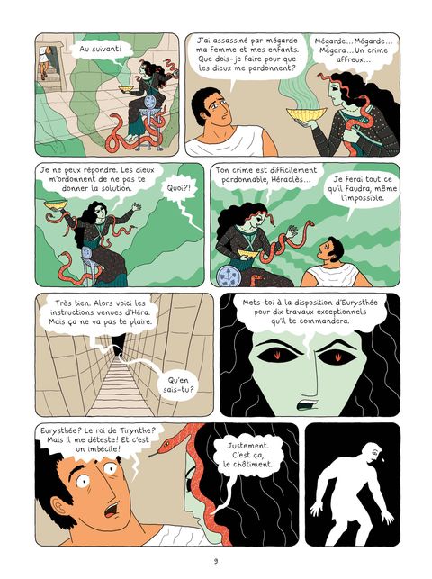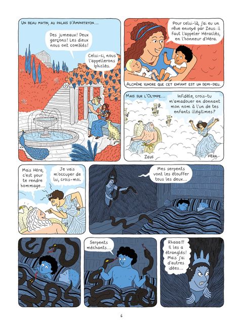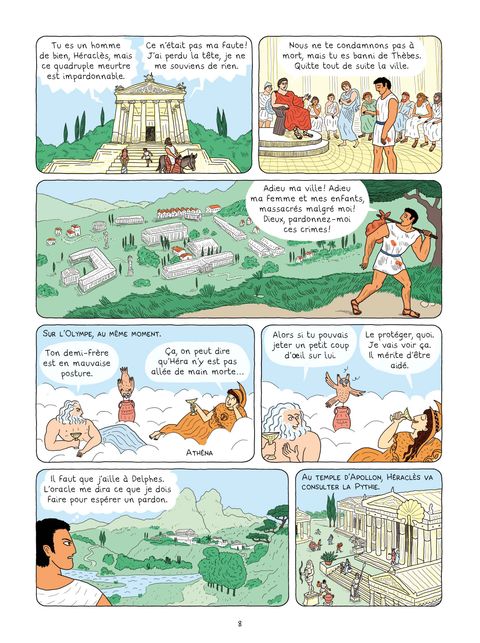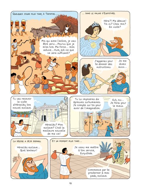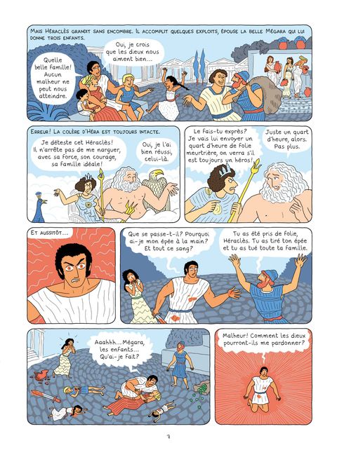 6 chapitres de bande dessinée pour tout savoir sur les douze travaux mythiques. Au fil des cases et des pages, on apprend comment Héraclès, fils de Zeus, en vient à tuer femme et enfants. On l'accompagne dans les tâches surhumaines qui lui permettront d'expier son crime : capturer le lion de Némée ou le sanglier d'Erymanthe, nettoyer les écuries d'Augias, se rendre aux Enfers, cueillir les pommes d'or du jardin des Hespérides, tuer l'hydre de Lerne... Une BD accessible à tous, riche en scènes d'action, et qui s'attache à rendre au personnage d'Héraclès (Hercule, pour les Romains) sa dimension tragique.