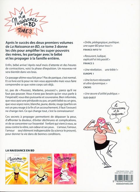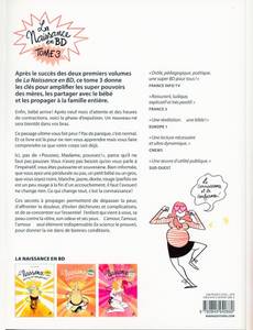 Ce tome 3 de <em>La Naissance en BD</em> vous donne les clés pour amplifier les super pouvoirs des mères, les partager avec le bébé, et les propager à la famille entière.Enfin, bébé arrive ! Après neuf mois d’attente et des heures de contractions, voici la phase d’expulsion. Un nouveau-né sera bientôt dans vos bras.Ce passage ultime vous fait peur ? Pas de panique, c’est normal. Et ce livre est là, pour ne rien vous apprendre mais vous faire comprendre ce que votre corps sait déjà.Ici, pas de «Poussez, Madame, poussez ! », parce qu’il ne faut pas pousser. Vous n’avez pas besoin qu’on vous parle à l’impératif, vous êtes puissante et souveraine. Bien informée, que vous ayez une péridurale ou pas, un petit bébé ou un gros, que vous soyez noire, blanche, jaune, dorée, rouge (parfois on est un peu rouge à la fin d’un accouchement, il faut l’avouer) ne change rien. Ce qui change tout, c’est le savoir !De la dilatation complète à la sortie du bébé, du premier cri à la délivrance du placenta... cette BD vous dévoile, en dessin et avec humour, la connaissance élémentaire de votre corps, de vos émotions et du processus de la naissance. Ces secrets à propager permettent de dépasser la peur, d’affronter la douleur, d’éviter déchirures et complications, et de se concentrer sur l’essentiel : l’enfant qui vient à vous, sa peau contre la vôtre, son odeur et ses yeux... L’amour, l’amour, l’amour... seul élément indispensable (la science le prouve), pour donner la vie dans de bonnes conditions.