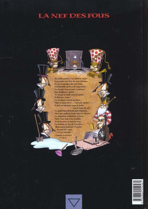 Six petits princes s'en allaient régner... Le premier eut bien du mal à freiner, et sur le parapet alla pulvériser l'élasmobile qu'il avait empruntée. Le second, trop occupé à nettoyer son somptueux palais ne vit pas la faille sous ses pieds. Il finit par chuter. Le troisième voulait jardiner, mais en plein hiver... faut pas rigoler il prit un méchant coup de froid [sur le bout du nez. Le quatrième désirait petit-déjeuner, mais une poêle en fonte vint à le blesser. Le cinquième souhaitait se laver, mais l'eau était trop mouillée. Il but la tasse et mourut noyé. Le sixième, en bas de l'escalier, rencontra ambroise premier. Et pour lui aussi, ce fut terminé. comptine eauxfolloise, vième siècle.