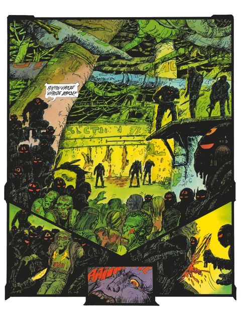 En 1975, Philippe Druillet perd sa femme Nicole, victime d’un cancer foudroyant. Il exorcise sa peine dans un album au pessimisme assumé, pointant l’absence totale d’échappatoire à l’issue finale. S’ouvrant sur une préface laissant éructer la rage de l’auteur, La Nuit nous décrit un monde en proie aux gangs de motards anarchiques ou autres barbares déglingués et accros à la dope, se dirigeant tous, au cours d’une bataille sanglante pour le « shoot » ultime, vers une fin inéluctable. Les planches grandioses s’y succèdent comme de véritables tableaux dressant le portrait d’une humanité en perdition, folle, désespérée et nihiliste.