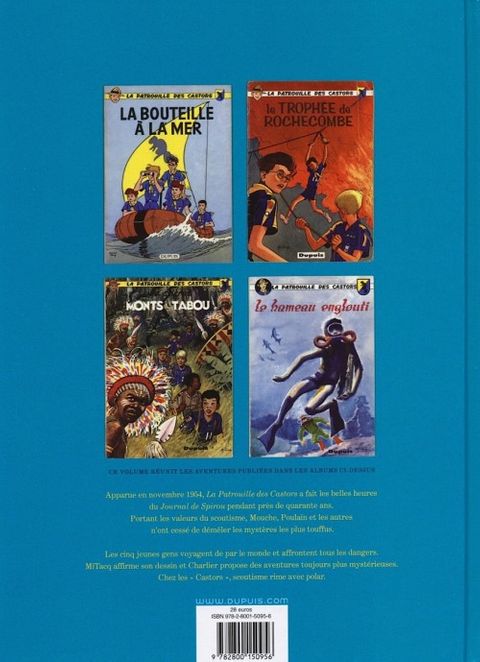 1957-1960 Le présent volume regroupe : "La bouteille à la mer", "Le Trophée de Rochecombe", "Le secret des Monts Tabou" et "Le hameau englouti". Créée en 1954, "La Patrouille des Castors" trouve immédiatement sa place, au sein du Journal de Spirou, parmi les histoires à suivre de Buck Danny, des aventures de Spirou ou encore Jerry Spring. Le succès rencontré dès ses débuts par la série ne se dément pas : le jeune public apprécie ces histoires de scouts, qui mêlent mystère, aventure et morale humaniste, qui participeront, quarante ans durant, à l'histoire du Journal de Spirou et de la BD franco-belge. MiTacq, dessinateur perfectionniste et travailleur acharné, affine son style, dont on peut considérer qu'il se stabilise en 1957, avec la parution de "La bouteille à la mer". Cet album, ainsi que "Le Trophée de Rochecombe", "Le secret des Monts tabou", "Le hameau englouti" sont regroupés dans le présent volume de l'Intégrale qui couvre la période 1957 -1960, une époque d'activité intense pour MiTacq et Jean-Michel Charlier, alors en train de poser les bases de ce qui sera le magazine Pilote.