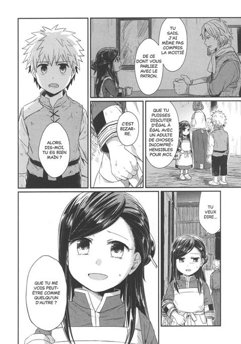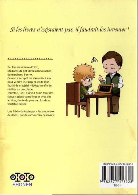 Par l'intermédiaire d'Otto, Maïn et Lutz ont fait la connaissance du marchand Benno. Celui-ci a accepté de s'associer à eux pour vendre leur papier, et de leur fournir le matériel nécessaire afin de réaliser un prototype. Toutefois, Lutz, qui voit Maïn tenir des conversations compliquées avec des adultes, doute de plus en plus de sa véritable nature. Une biblio-fantaisie pour les amoureux des livres, par des amoureux des livres !