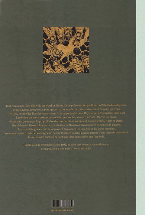 Quand une ruche essaime, la vieille reine s'en va avec ses abeilles, laissant la ruche à la nouvelle reine encore vierge qui se prépare à accomplir son vol nuptial. Elle sera fécondée par plusieurs mâles qui perdront la vie. Le naturaliste Jean-Claude Servais, signature pionnière de la collection Aire Libre, construit son intrigue en miroir des insectes. Un thriller politico-apicole autour d'une lutte de pouvoir et de femmes-abeilles, aux accents romantiques et écologiques très actuels. Tout commence dans une ville du Nord quand, à l'issue d'une présentation sur des abeilles himalayennes, l'espèce la plus grosse et la plus agressive du monde, la ruchette est volée : les abeilles libérées assassinent. Une aubaine pour le patron de l'usine locale, M. Raymackers, qui décide de se présenter contre le maire sortant, Marcel Clément, en ordonnant l'extermination de son rucher dont s'occupent ses deux filles, Aude et Diane, très proches des abeilles. Peut-être même trop ?