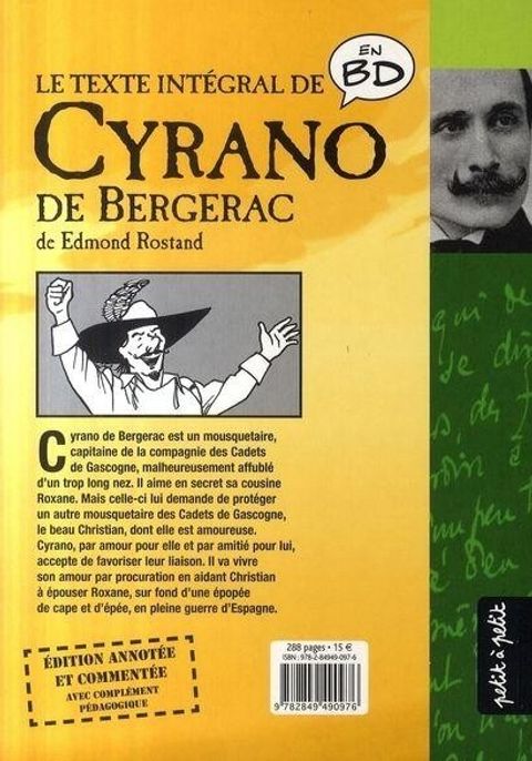 Cyrano de Bergerac est le personnage principal éponyme de la plus célèbre pièce d'Edmond Rostand (1868-1918), Cyrano de Bergerac, écrite en 1897 et jouée pour la première fois le 28 décembre de la même année au théâtre parisien de la porte Saint-Martin, avec un succès immédiat et considérable. Cette comédie héroïque en cinq actes et en vers relate donc la vie de Cyrano de Bergerac ; de Roxane, dont il est épris ; et de Christian, dont Roxane est éprise. Pour compenser un amour qu'il croit impossible, Cyrano va donc vivre cet amour par procuration en aidant Christian à épouser Roxane. Tout cela sur fond d'une épopée de cape et d'épée, en pleine guerre d'Espagne. Tout en respectant le texte intégral, le jeune dessinateur et scénariste de BD Fanch Juteau offre une seconde vie à cette oeuvre, devenue incontournable dans les programmes scolaires.
