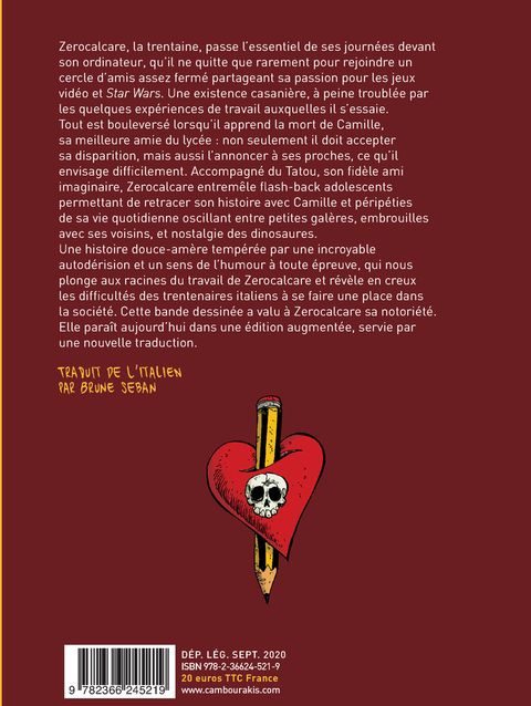 Véritable phénomène en Italie, cet album qui a fait découvrir Zerocalcare s'y est vendue à des dizaines de milliers d'exemplaires. Traduite il y a quelques années en France mais passée relativement inaperçue, cette édition en propose une nouvelle traduction par Brune Seban, traductrice, entre autres, de "Kobane Calling", ainsi que des planches inédites réalisées par l'auteur en 2017, apportant un contrepoint à son travail initial. On y suit la trajectoire d'un trentenaire romain appartenant pleinement à la génération 2.0. Lorsqu'il apprend la mort d'une amie d'enfance dont il a toujours été amoureux, il peine à l'annoncer à ses proches. Accompagné de son fidèle ami imaginaire le Tatou, Zerocalcare entremêle dans cet album flash-backs adolescents permettant de retracer l'histoire de son amitié avec Camille et péripéties de sa vie quotidienne oscillant entre petites galères, embrouilles avec ses voisins, et nostalgie des dinosaures. Un brillant mélange d'humour et de tendresse, qui fait tout le talent de Zerocalcare.