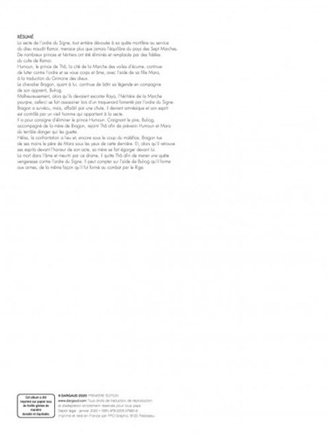 Le chevalier Bragon poursuit son périple au coeur de des terres éclatées de La Marche et affronte la secte de l'Ordre du Signe, de plus en plus menaçante. Mais Bragon, esseulé depuis la mort du père de Mara, peut compter sur l'aide de Bulrog qu'il forme aux armes, de la même façon qu'il fut formé au combat par Le Rige. La Conque de Ramor, protégée par les habitants de la cité des Gris-Grelets, est menacée, devenant un objet de convoitise et un enjeu pour chaque camp, notamment pour la secte de l'Ordre du Signe. Afin d'avoir le champ libre, elle doit d'abord se débarrasser de Bragon et fait alors appel à la tribu des Méridines dont fait partie Kryll, une jeune femme vierge. Les femmes de cette tribu ont en effet un terrible pouvoir, celui de secréter une substance mortelle qui s'insinue dans le corps de leur premier amant...