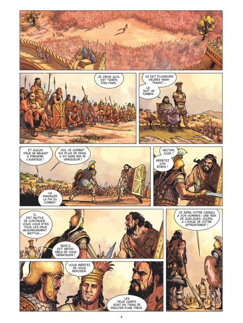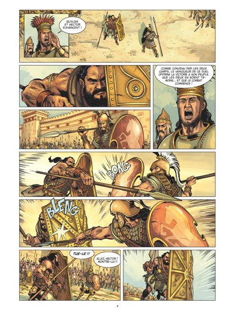 Les dieux ont leurs caprices. Les hommes leurs destinées. Pour mettre un terme aux combats qui s'éternisent, grecs et troyens décident d'envoyer chacun leur champion respectif : Ajax et Hector. Mais les deux héros, de force égale, n'arrivent pas à se départager. L'issue de la guerre de Troie semble bien incertaine, surtout qu'Achille refuse toujours d'aller se battre... et que les dieux n'ont pas fini de venir y régler leurs querelles personnelles. Redécouvrez en BD L'Iliade, l'un des écrits les plus anciens et les plus célèbres de la Grèce antique. Un récit riche et passionnant, qui incarne à lui-seul tout ce qui fait l'essence de la mythologie grecque.