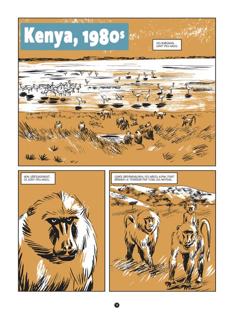 L’homme, le plus cruel des primatesEntre 1978 et 1990, Robert Sapolsky et Lisa Share-Sapolsky ont étudié plusieurs troupes de babouins au cœur d’une réserve natu­relle au Kenya. Leurs observations sont sans appel : quand les mâles alpha qui font régner la terreur sont décimés à la suite d’une contamination, les agressions et le stress baissent au sein des troupes, qui retrouvent l’harmonie du vivre-ensemble et s’épouillent en paix… Qu’en est-il dans nos Sociétés occidentales ?États-Unis, de nos jours. Aux quatre coins du pays, on dénombre des crimes sordides. Ces exactions, a priori isolées, intriguent le FBI, qui commence à faire le lien entre les différentes affaires. Car à chaque fois, ce sont des hommes de pouvoir qui sont visés, et leurs femmes systématiquement épargnées. C’est d’abord un célèbre avocat, mêlé à divers scandales sexuels et financiers, qui est assassiné sous les yeux de sa maîtresse… Colleen Thompson, la jeune agente du FBI en charge de l’enquête, dresse le profil d’un tueur caméléon, ou plutôt celui d’une tueuse ! Quelles sont ses véritables motivations ? S’agit-il d’une affaire politique ou d’une violente déclaration de guerre au patriarcat ? Alors que l’enquête s’enlise, la main vengeresse de cette femme insaisissable frappe de nouveau. Mais cette fois, c’est bien une femme qui est visée : une candidate républicaine au programme conservateur… Au même moment dans le Missouri, un suprémaciste blanc ouvre le feu et fait plusieurs victimes innocentes entre les murs de Lincoln University ! Cet homme pourrait-il être la prochaine victime ? En attendant, il trouve refuge dans une communauté religieuse paramilitaire. C’est dans ce coin reculé de l’Oklahoma que tout va se jouer… Si le FBI a pu identifier les lieux et s’apprête à intervenir, la tueuse ne doit pas être loin non plus…La tension monte à la lecture du nouveau roman graphique d’Emmanuel Moynot (Fauve Polar SNCF en 2020 pour No Direction) qui brouille les pistes jusqu’à la fin ! Dans ce polar sombre où l’on retrouve les influences de James Ellroy et Jean-Patrick Manchette, l’auteur se livre à un parallélisme saisissant qui donne à réfléchir. À travers un éclairage ethnologique déconcertant, il analyse les dérives des comportements humains et les compare à celles d’une tribu de babouins. Une fable noire, cynique et critique des États-Unis pour une double lecture au graphisme glaçant.