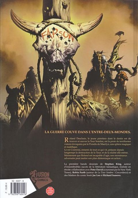 Roland Deschain, le jeune pistolero dont le destin est de trouver et sauver la Tour Sombre, est la proie de terrifiantes visions invoquées par le Pomélo de Maerlyn ; une sphère magique et maléfique. Le roi Cramoisi, ennemi de tout ce qui vit, prépare depuis longtemps la destruction de la Tour, et de la réalité elle-même. Maintenant que Roland est incapable d'agir, son monstrueux adversaire peut mettre son plan démoniaque en action... La première bande dessinée de Stephen King, auteur d'innombrables succès de la littérature fantastique, réalisée en étroite collaboration avec Peter David (couronné par le New York Times), Robin Furth (auteur de La Tour Sombre : Concordance) et des Maîtres du comic book Jae Lee et Richard Isanove.