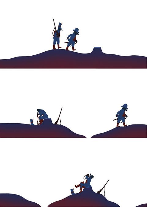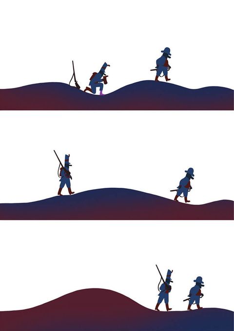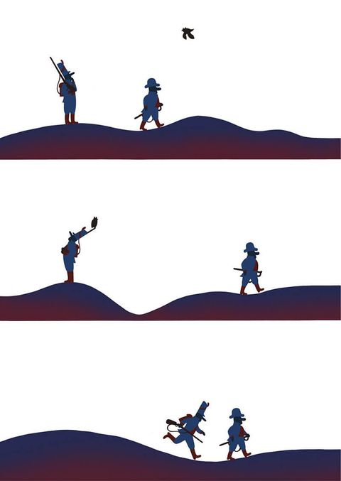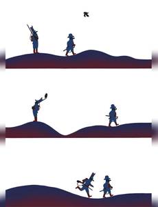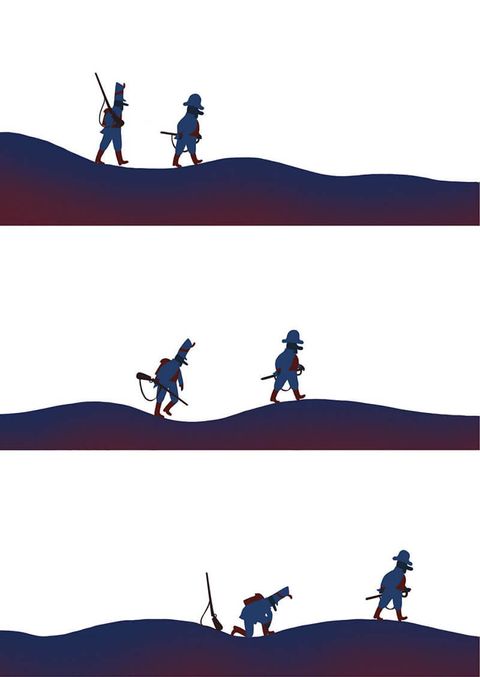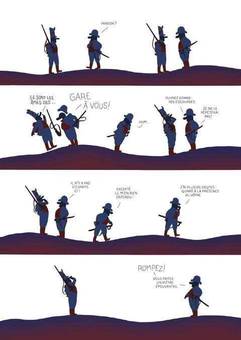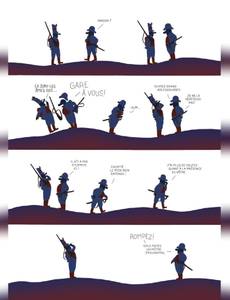"- La Guerre fait de la pâtée des héros et des justiciers". Le soldat Firmin et son Capitaine arpentent une ligne d'horizon sans fin. Tandis que le Capitaine, sentencieux et sûr de lui, soliloque sur l'Ennemi à pourfendre, Firmin ironise sur leur situation de soldats en errance : séparés de leur régiment, ils cherchent à retrouver le front. Mais ce chemin n'est pas tracé, et la bataille semble se jouer toujours un peu plus loin... Faute de fracas et de combats, nos soldats traversent une nature silencieuse ; pourtant, si la Guerre semble se dérober, ses stigmates sont tout aussi assourdissants... Un vieillard qui sombre dans la folie, une mère près d'un bûcher, une auberge pillée : les notes se font dissonantes et viennent ébranler la foi et la raison de nos deux compères. Firmin, tantôt candide, tantôt piquant, et le Capitaine, que son amour de la Patrie aveugle souvent, déambulent d'une rencontre à l'autre, comme menés par un invisible joueur de flûte - et leur voyage devient initiation. Nourri par Beckett et Buzatti, Clément Paurd nous parle ici de nationalisme, d'aveuglement et d'absurdité. Sans jamais quitter ses deux personnages ni changer de cadrage - à la façon d'une pièce de théâtre - il s'appuie sur un vocabulaire formel limpide et conctré, ce qui donne toute sa force à son récit. Il traite ces thématiques intemporelles avec délicatesse et intelligence, nous offrant ainsi un livre d'une grande finesse et d'une lucidité implacable.