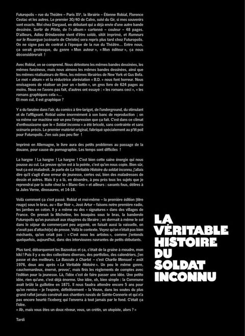 La Véritable Histoire du soldat inconnu Mort le 10 novembre 1918 dans la boue, inhumé le 11 novembre 1918 sous l'Arc de Triomphe, auteur de romans d'aventure à cent sous, simplistes et affligeants, considéré comme " une sacrée tête de con " par ses compagnons de tranchées, voilà pour Tardi qui était le soldat inconnu ! Il plonge cet anti-héros en plein délire cauchemardesque. L'homme qui a passé sa vie à créer des êtres ignobles, malsains et néfastes pour plaire au public et satisfaire son éditeur, est amené à les rencontrer. Les confrontations, parfois teintées d'humour noir, sont toujours violentes et douloureuses. Ce récit onirique d'une force narrative envoûtante, au dessin puissant et somptueux, est une pièce incontournable de l'oeuvre de Tardi. La Bascule à Charlot Au matin d'une nuit d'errance et d'alcool, un homme se réveille chez une prostituée. Peu de temps après, il la découvre à côté de lui, sans vie, poignardée, tout comme le handicapé " monstrueux " qui vivait chez elle. Il s'enfuit, est rapidement arrêté et condamné à mort. Il ne sait pas si c'est lui qui a commis ses meurtres. Le lecteur non plus. Il doute de sa santé mentale. Le lecteur aussi, qui assiste à son exécution.